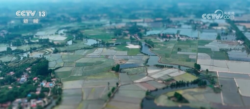 現(xiàn)在您看到的是河南信陽(yáng)淮河以南的水稻插秧現(xiàn)場(chǎng)。插秧機(jī)在田間穿梭,一株株茁壯的秧苗被整齊有序地植入田間,一會(huì)兒工夫就插滿了整塊稻田??罩懈╊?,一臺(tái)臺(tái)插秧機(jī)在農(nóng)機(jī)手的操控下好似一把把畫刷,在稻田上輕輕暈染,繪就丹青。而同在信陽(yáng),淮河以北的麥田里,則是金色的麥浪翻滾起伏,收割機(jī)馳騁田間,飽滿的麥穗被卷入機(jī)艙,經(jīng)過(guò)收割、脫粒,顆粒歸倉(cāng)。