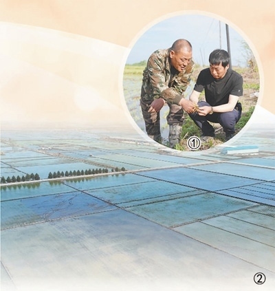 圖①:于海河(右)在田間地頭和村民一起查看水稻長勢。 本報(bào)記者 方 圓攝圖②:完成了機(jī)械化插秧的水稻田。虎林市委宣傳部供圖