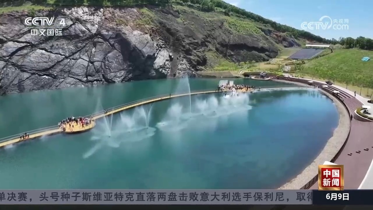 在黑龍江雙鴨山的翡翠湖礦坑公園,藍綠色湖水在陽光照耀下如詩如畫,游客們身處山野間,感受著自然之美和夏日清涼。