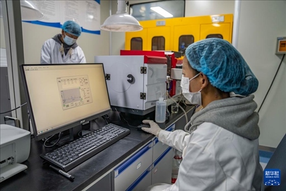 ?在聶榮縣嘎確生態(tài)畜牧業(yè)發(fā)展有限責(zé)任公司,檢驗(yàn)員達(dá)娃卓瑪在檢測(cè)奶制品(5月13日攝)。新華社記者 孫非 攝
