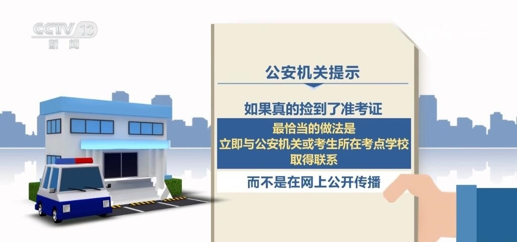 公安機(jī)關(guān)提示:如果真的撿到了準(zhǔn)考證,最恰當(dāng)?shù)淖龇ㄊ橇⒓磁c公安機(jī)關(guān)或考生所在考點(diǎn)學(xué)校取得聯(lián)系,而不是在網(wǎng)上公開(kāi)傳播。另外,如果看到此類信息的網(wǎng)友,未經(jīng)核實(shí)的情況下不轉(zhuǎn)發(fā)、不跟貼、不評(píng)論,不撥打相關(guān)聯(lián)系電話,謹(jǐn)防上當(dāng)受騙。