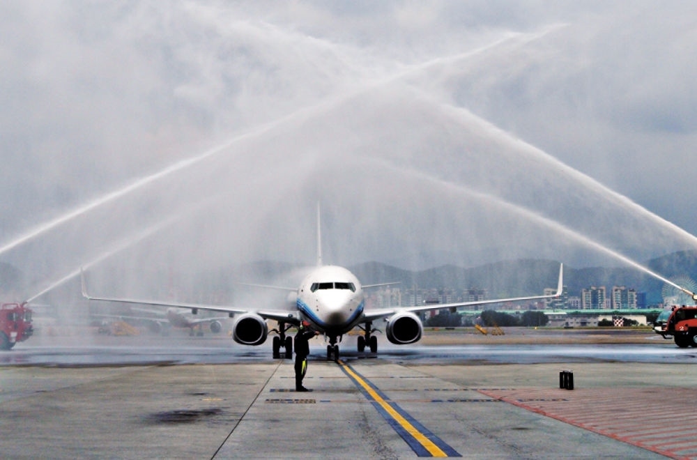 2008年,兩岸“三通”啟動(dòng)常態(tài)包機(jī),廈航成為廈門(mén)、福州和杭州航點(diǎn)的運(yùn)營(yíng)航空公司。這是2008年12月15日,臺(tái)北松山機(jī)場(chǎng)以“水門(mén)”儀式迎接廈航常態(tài)化包機(jī)。
