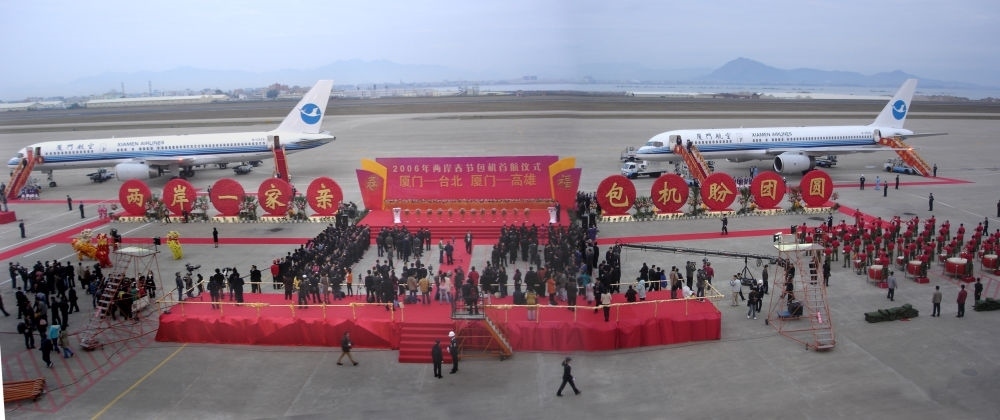 2006年,廈航作為新增廈門(mén)航點(diǎn)的唯一運(yùn)營(yíng)航空公司,執(zhí)行了廈門(mén)-臺(tái)北、廈門(mén)-高雄航線的包機(jī)任務(wù)。這是首航儀式現(xiàn)場(chǎng)。