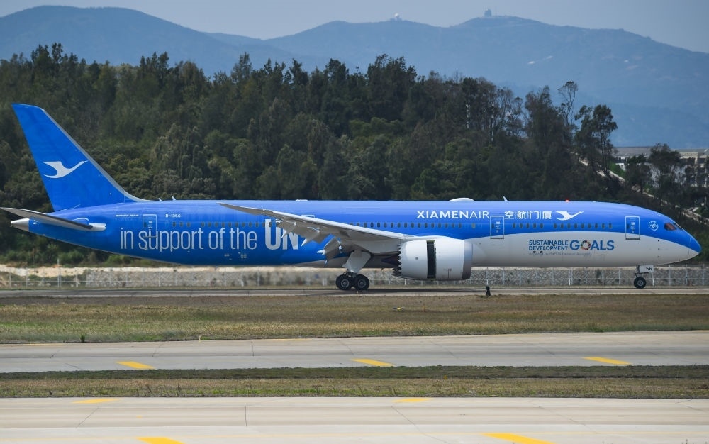 2018年3月21日,聯(lián)合國(guó)特殊涂裝飛機(jī)廈門(mén)航空“聯(lián)合夢(mèng)想號(hào)”正式在福建福州長(zhǎng)樂(lè)國(guó)際機(jī)場(chǎng)亮相。新華社記者 宋為偉 攝