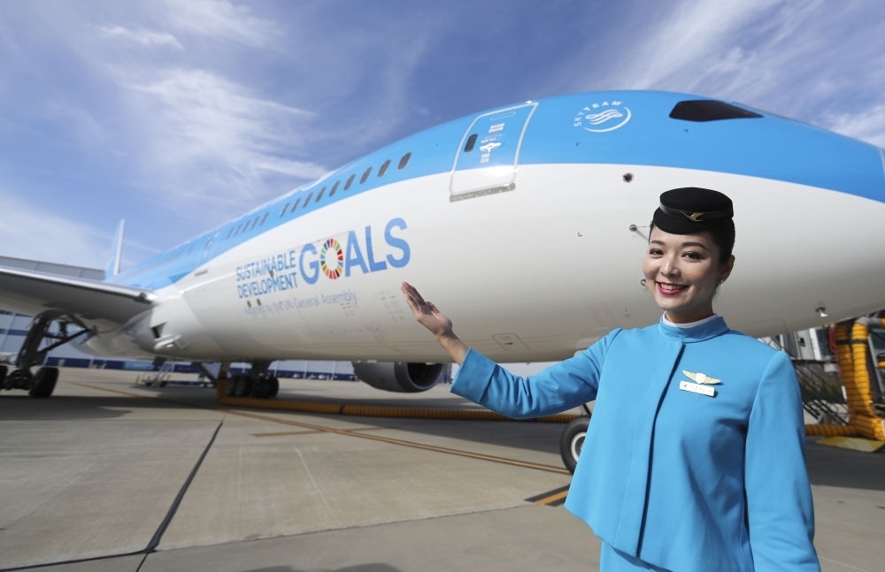 2018年1月26日,在美國(guó)查爾斯頓波音工廠,中國(guó)廈門(mén)航空公司的一名空乘人員展示廈航首架涂裝宣傳聯(lián)合國(guó)可持續(xù)發(fā)展目標(biāo)的客機(jī)。新華社記者 王迎 攝