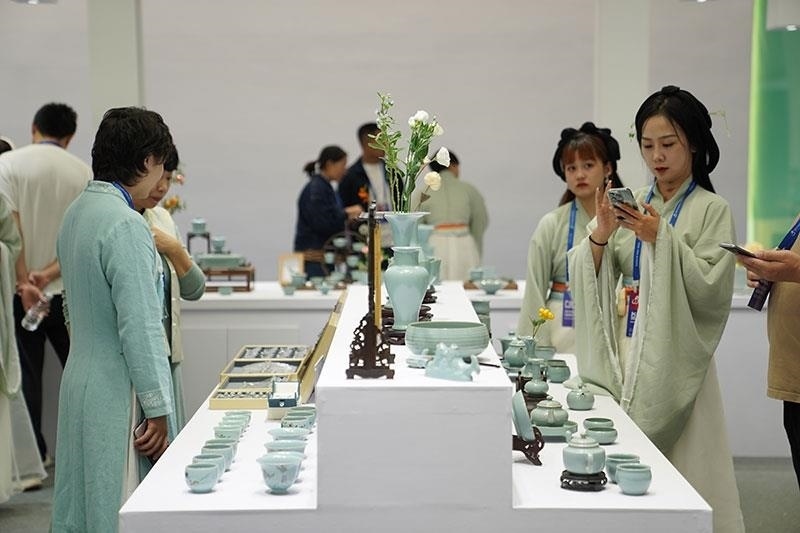 △2023年10月18日,人們?cè)?023中國景德鎮(zhèn)國際陶瓷博覽會(huì)汝窯展臺(tái)參觀。