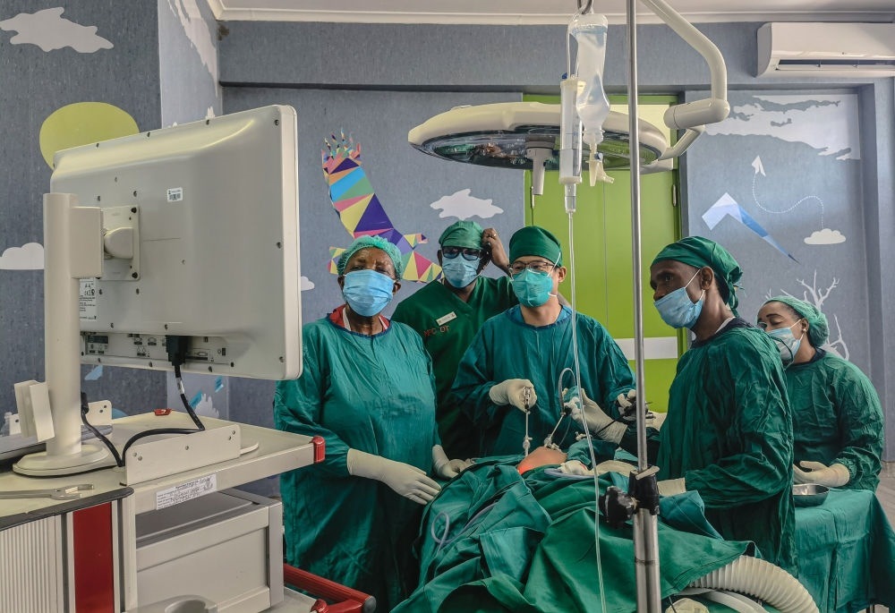 2022年10月26日,中國(guó)援坦桑尼亞醫(yī)療隊(duì)小兒外科醫(yī)生丁國(guó)建(中)在坦桑尼亞達(dá)累斯薩拉姆的穆欣比利國(guó)立醫(yī)院實(shí)施小兒腹腔鏡手術(shù)(手機(jī)照片)。