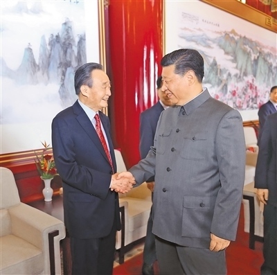 2021年7月1日,慶祝中國共產(chǎn)黨成立100周年大會在北京天安門廣場隆重舉行。這是慶祝大會前,習(xí)近平同志與吳邦國同志握手。新華社記者 鞠 鵬攝