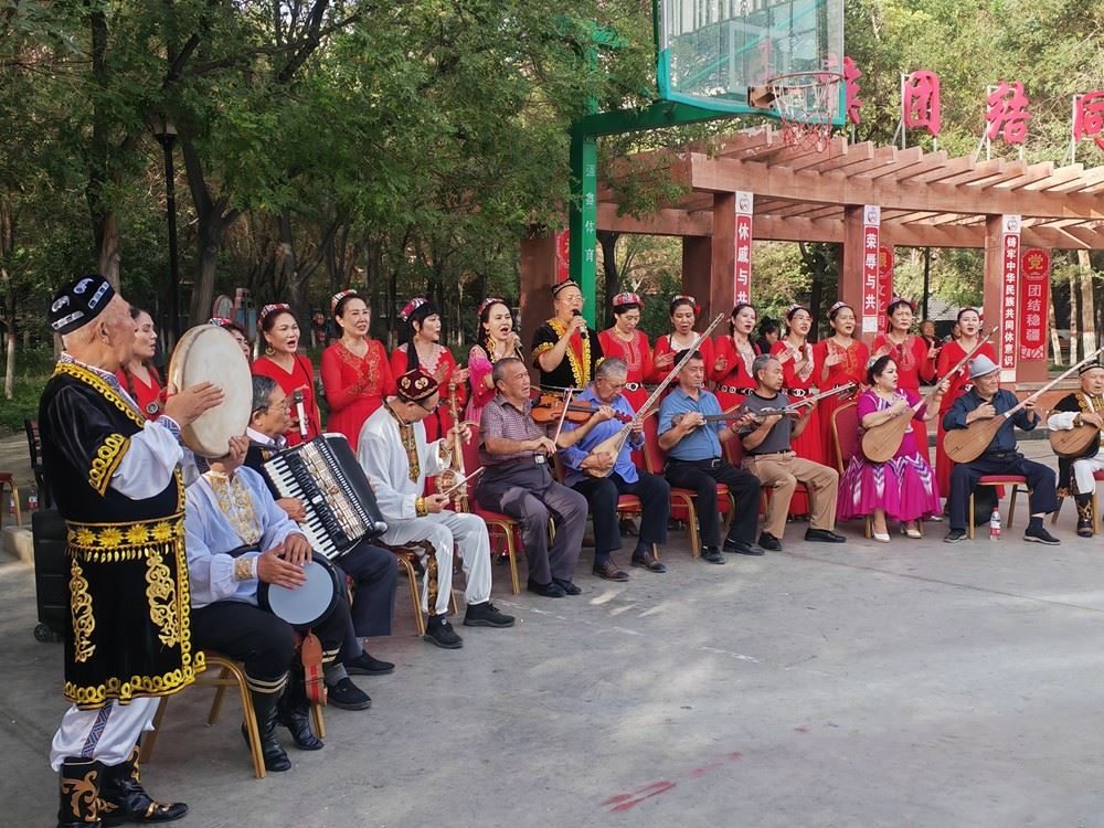 2024年9月19日,新疆庫(kù)爾勒市朝陽(yáng)街道團(tuán)結(jié)社區(qū)石榴籽樂(lè)團(tuán)在為居民們表演。新華社記者 顧煜 攝