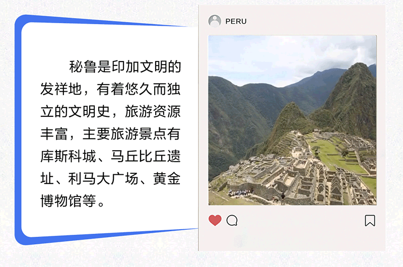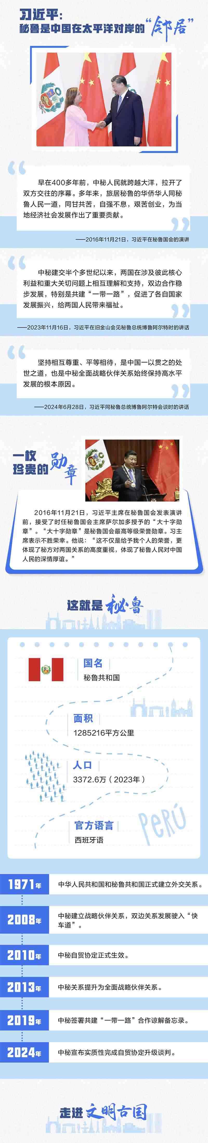 中國和秘魯都是文明古國,兩國友誼源遠(yuǎn)流長,人民友好深入人心。習(xí)近平主席曾以“秘魯是中國在太平洋對岸的‘鄰居’”形容中秘關(guān)系,生動詮釋了兩國和兩國人民之間“相知無遠(yuǎn)近”的深厚友誼。