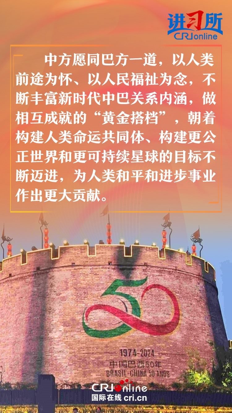 今年是中巴建交50周年。習(xí)近平指出,回首過去50年,中巴關(guān)系跨越山海,探索出發(fā)展中大國相互尊重、互利友好、合作共贏的正確相處之道。中方愿同巴方一道,以人類前途為懷、以人民福祉為念,不斷豐富新時代中巴關(guān)系內(nèi)涵,做相互成就的“黃金搭檔”,朝著構(gòu)建人類命運共同體、構(gòu)建更公正世界和更可持續(xù)星球的目標不斷邁進,為人類和平和進步事業(yè)作出更大貢獻。