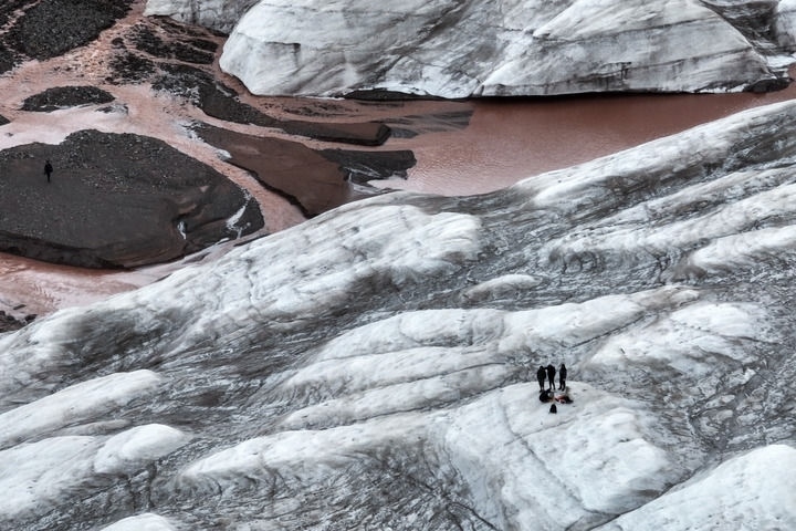 2024年7月25日,在青海省三江源區(qū)冬克瑪?shù)妆?,江源綜合科學(xué)考察隊(duì)員在探測(cè)冰川。新華社記者 伍志尊 攝