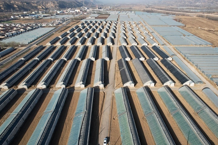 2023年11月26日,甘肅省平?jīng)鍪袥艽h涇汭河川區(qū)萬(wàn)畝設(shè)施蔬菜產(chǎn)業(yè)園王村核心區(qū)(無(wú)人機(jī)照片)。這是當(dāng)?shù)匾劳刑旖蚴袞|西部協(xié)作幫扶資金實(shí)施的聯(lián)建項(xiàng)目。新華社記者 范培珅 攝
