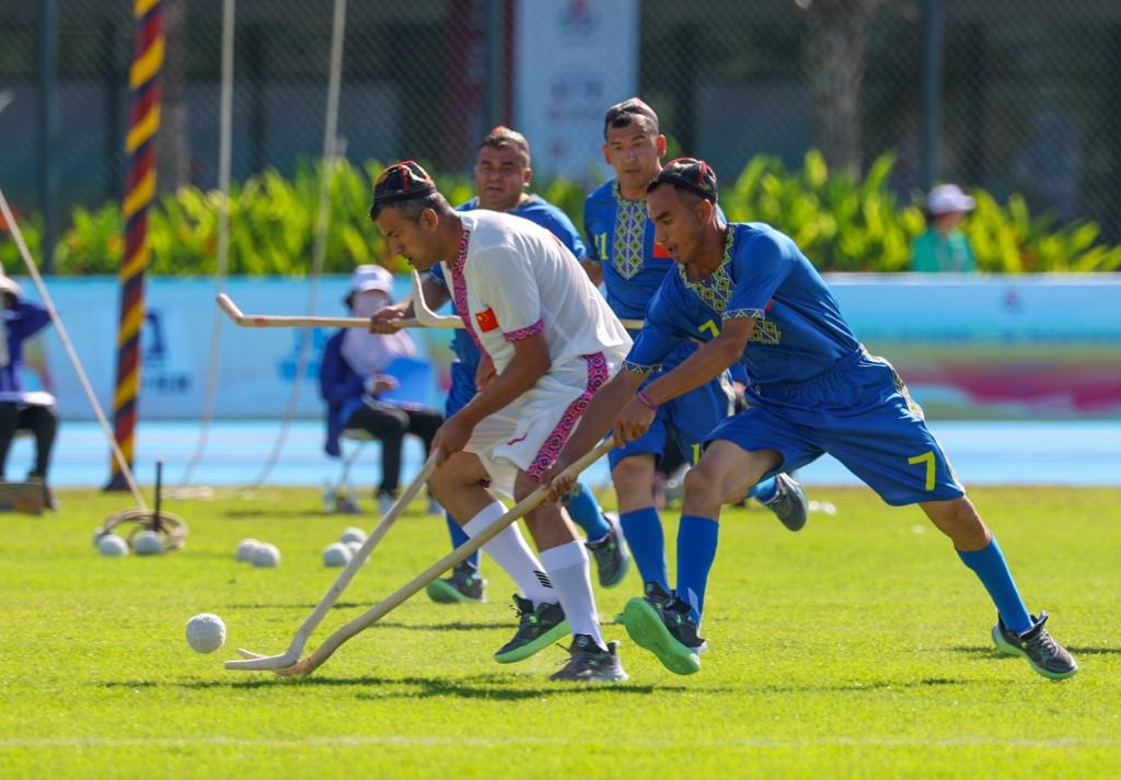 ??山海難擋情意濃。在24日的表演項(xiàng)目里,10多名來自新疆和田地區(qū)于田縣各行各業(yè)的隊(duì)員帶來了麥熱球表演。山高路遠(yuǎn),他們歷時(shí)三天才抵達(dá)三亞?!拔覀兿胂蛉珖嗣裾故钧湡崆蜻@項(xiàng)運(yùn)動(dòng),在場外和大家多交流,讓各族人民了解南疆的發(fā)展變化?!标?duì)長吾買爾江說。