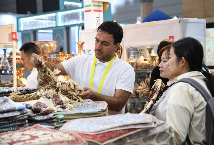 2024年9月20日,在陜西省西安市舉行的第八屆絲綢之路國際博覽會上,來自伊朗的參展商(前左一)向觀眾介紹產品。 新華社記者 張博文 攝