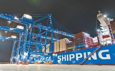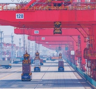 軟聯(lián)通共建“一帶一路”國家在工作制度對接、技術(shù)標(biāo)準(zhǔn)協(xié)調(diào)、檢驗(yàn)結(jié)果互認(rèn)等方面強(qiáng)化合作、統(tǒng)一標(biāo)準(zhǔn),貿(mào)易自由化便利化水平不斷提升。上海洋山港海關(guān)對接共建國家進(jìn)出口貨物相關(guān)標(biāo)準(zhǔn),推動通關(guān)一體化方式申報,提升通關(guān)效率。圖為無人駕駛的全自動導(dǎo)引車在洋山港穿梭往來,搬運(yùn)集裝箱。王 初攝(影像中國)