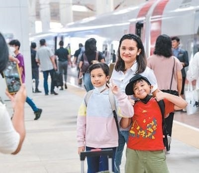 硬聯(lián)通雅萬高鐵是我國在境外完成全過程勘察設(shè)計建設(shè)的首個高鐵項(xiàng)目,于去年10月17日正式開通運(yùn)營,是中印尼共建“一帶一路”合作的典范。圖為乘客在和雅萬高鐵動車組合影留念。新華社記者 徐 欽攝