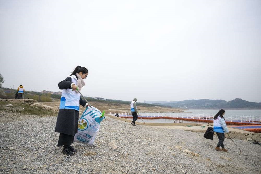2024年11月28日,清漂志愿者在南陽市淅川縣鸛河流域城區(qū)段作業(yè)。