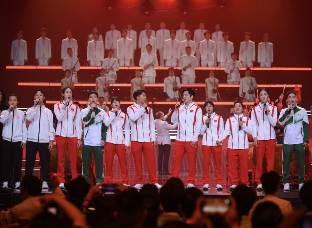 2024年9月22日,在2024“灣區(qū)升明月”大灣區(qū)電影音樂(lè)晚會(huì)上,澳門體育運(yùn)動(dòng)員代表與參加巴黎奧運(yùn)會(huì)的內(nèi)地健兒一起演唱歌曲。