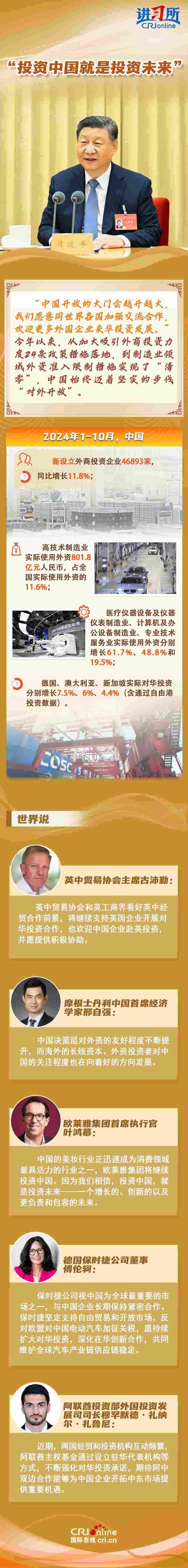 “中國是實(shí)干家、行動派?!苯衲暌詠?,從習(xí)近平主席的歐洲之行到拉美之行,再到四天前在北京會見主要國際經(jīng)濟(jì)組織負(fù)責(zé)人,習(xí)近平一直強(qiáng)調(diào),中國的發(fā)展將給世界帶來巨大機(jī)遇。據(jù)聯(lián)合國貿(mào)易和發(fā)展會議不久前發(fā)布的《世界投資報(bào)告2024》中文版顯示,中國吸引外資的結(jié)構(gòu)不斷優(yōu)化、質(zhì)量不斷提高,多位政商界人士也認(rèn)為中國是一個非常有前景的市場,投資中國就是投資未來。