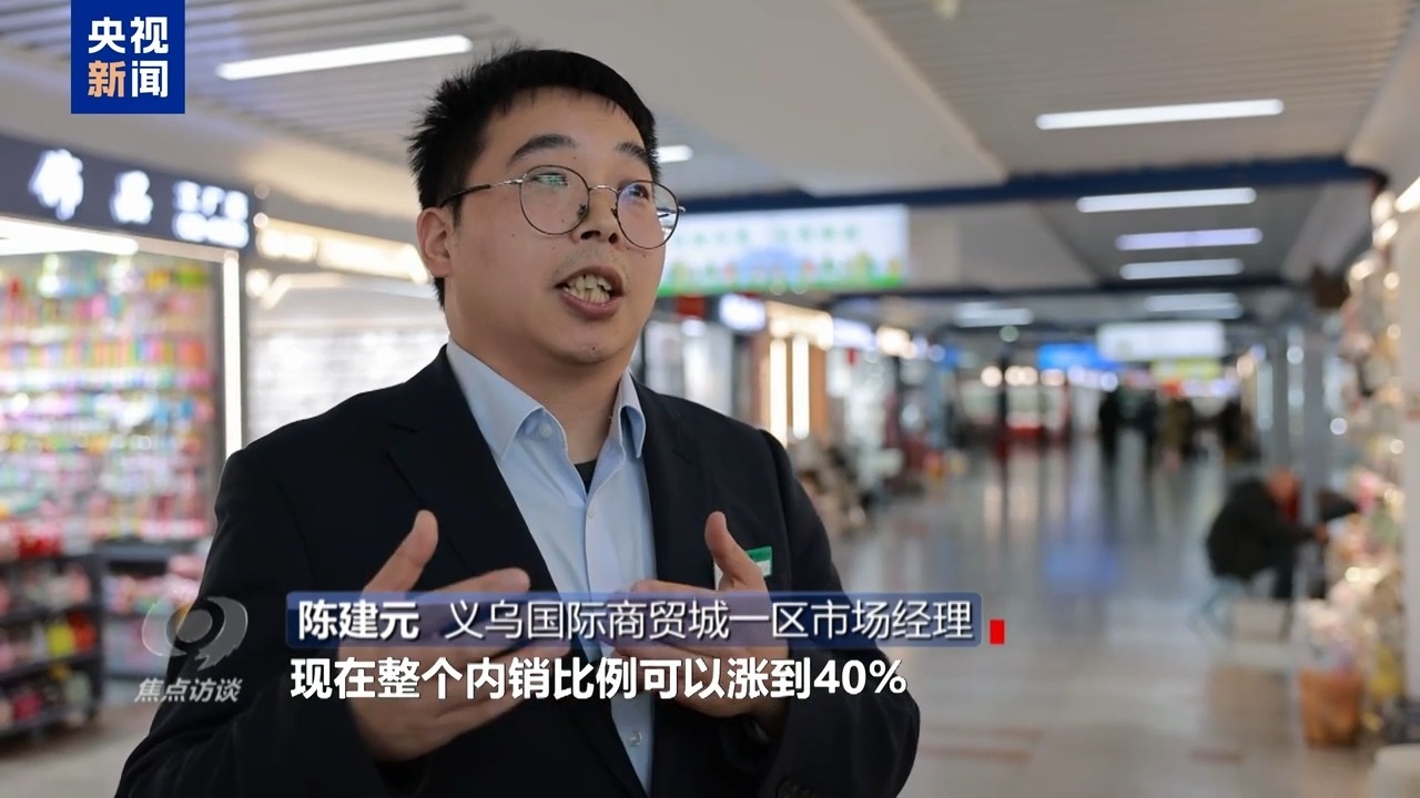 義烏國(guó)際商貿(mào)城一區(qū)市場(chǎng)經(jīng)理 陳建元:我們有一個(gè)統(tǒng)計(jì),拿我們的飾品行業(yè)來(lái)說(shuō),經(jīng)過(guò)這幾年培育,直播電商的快速發(fā)展,有些經(jīng)營(yíng)戶轉(zhuǎn)型,現(xiàn)在整個(gè)內(nèi)銷比例可以漲到40%,比例還是有一個(gè)很明顯的提升。