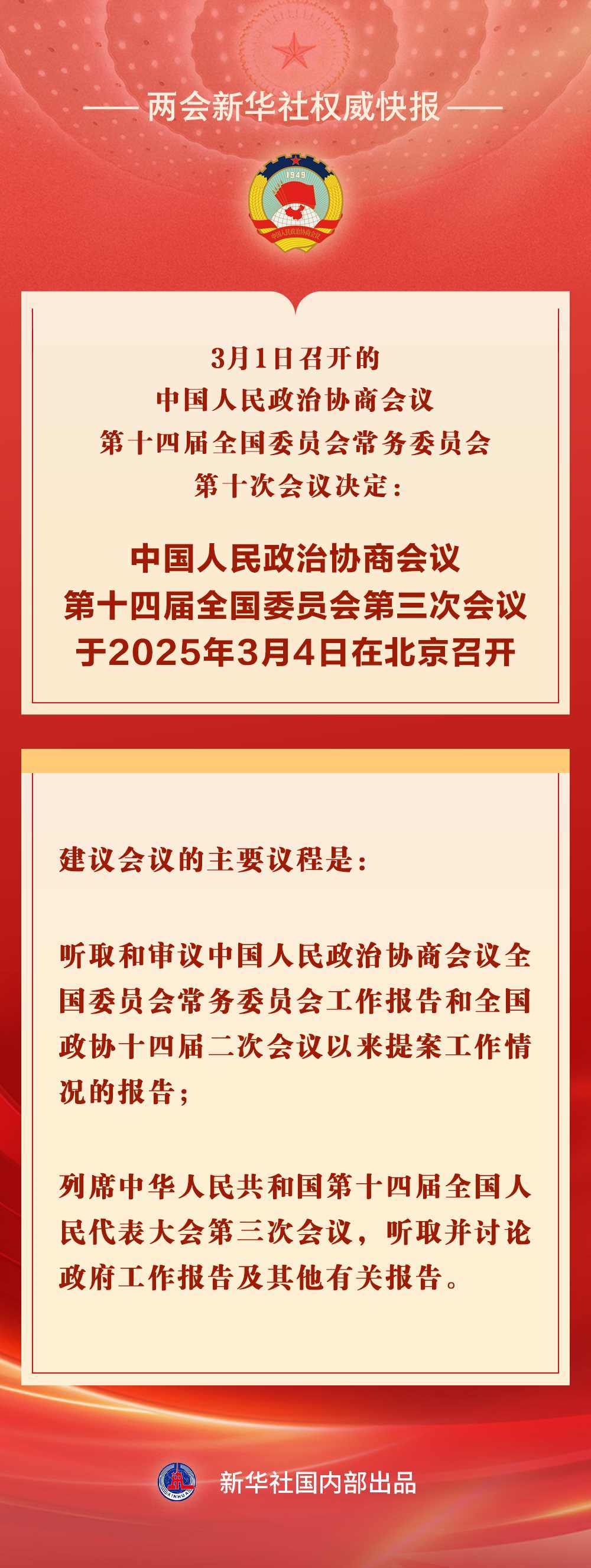 3月1日召開的中國人民政治協(xié)商會議第十四屆全國委員會常務委員會第十次會議決定:中國人民政治協(xié)商會議第十四屆全國委員會第三次會議于2025年3月4日在北京召開。建議會議的主要議程是:聽取和審議中國人民政治協(xié)商會議全國委員會常務委員會工作報告和全國政協(xié)十四屆二次會議以來提案工作情況的報告;列席中華人民共和國第十四屆全國人民代表大會第三次會議,聽取并討論政府工作報告及其他有關報告。