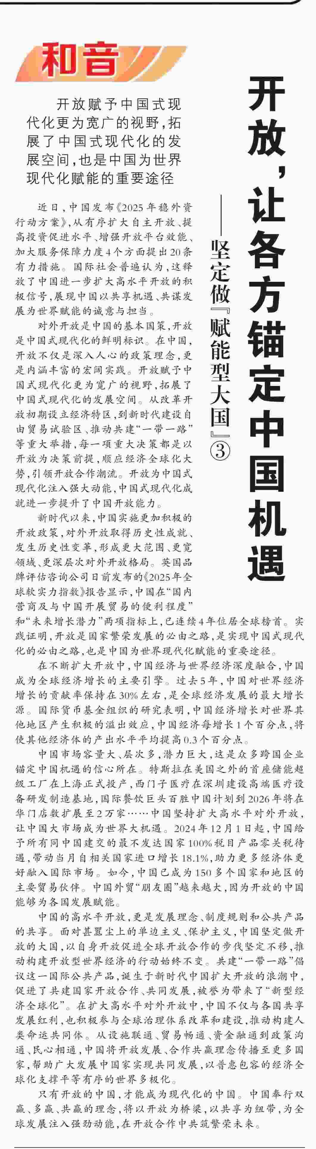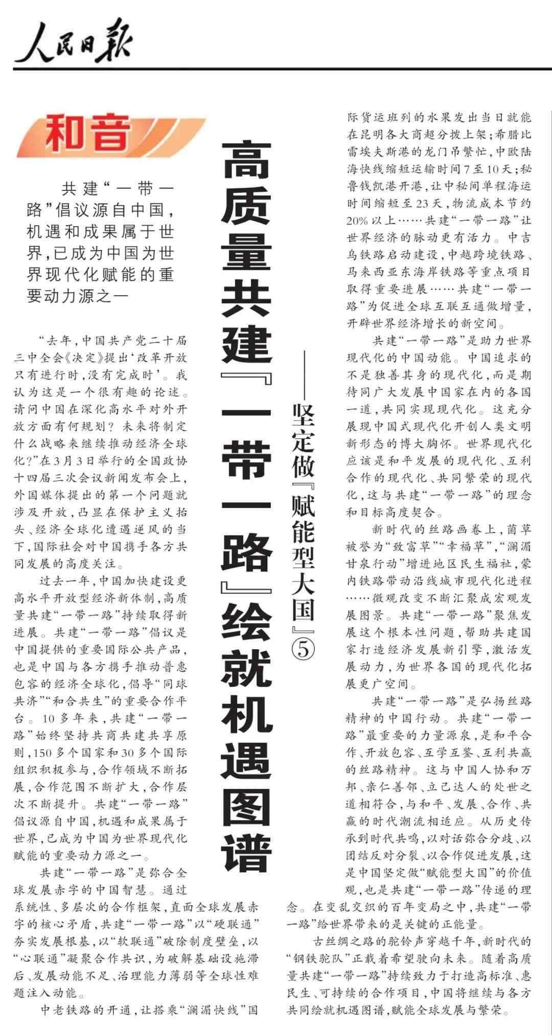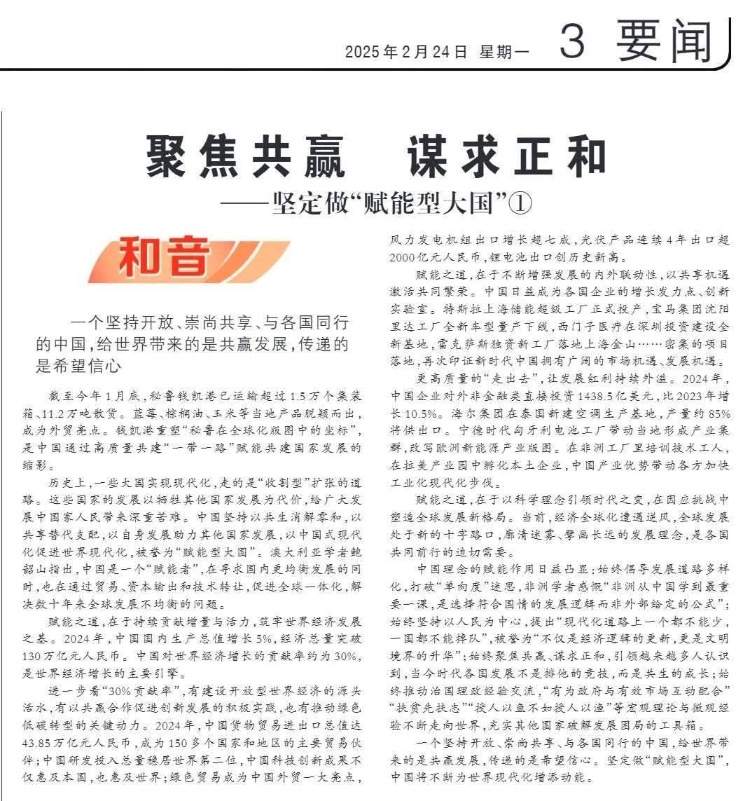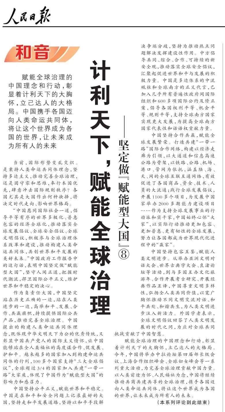 近期,《人民日報》“和音”欄目推出“堅定做‘賦能型大國’”系列評論,圍繞科技創(chuàng)新、開放共贏、綠色轉(zhuǎn)型、高質(zhì)量共建“一帶一路”、多邊治理等熱點議題,從不同角度闡釋中國何以成為一個“賦能型大國”的深層邏輯,展現(xiàn)中國始終秉持構(gòu)建人類命運(yùn)共同體理念,不斷以中國式現(xiàn)代化為世界現(xiàn)代化賦能的大國擔(dān)當(dāng)。