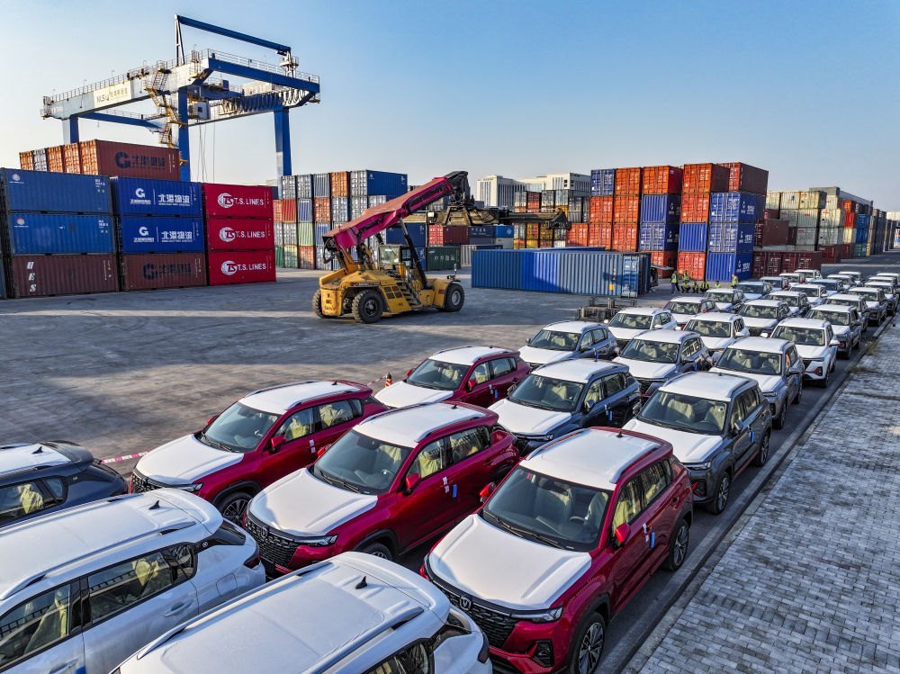 2024年10月28日在重慶國際物流樞紐園區(qū)西部陸海新通道重慶無水港拍攝的出口汽車裝運(yùn)現(xiàn)場(無人機(jī)照片)。位于重慶市沙坪壩區(qū)的重慶國際物流樞紐園區(qū),是重慶中歐班列、西部陸海新通道班列、渝滿俄班列、渝甬班列的主要到發(fā)點,截至2024年10月,已開通班列線路62條,輻射125個國家和地區(qū)的542個港口。
