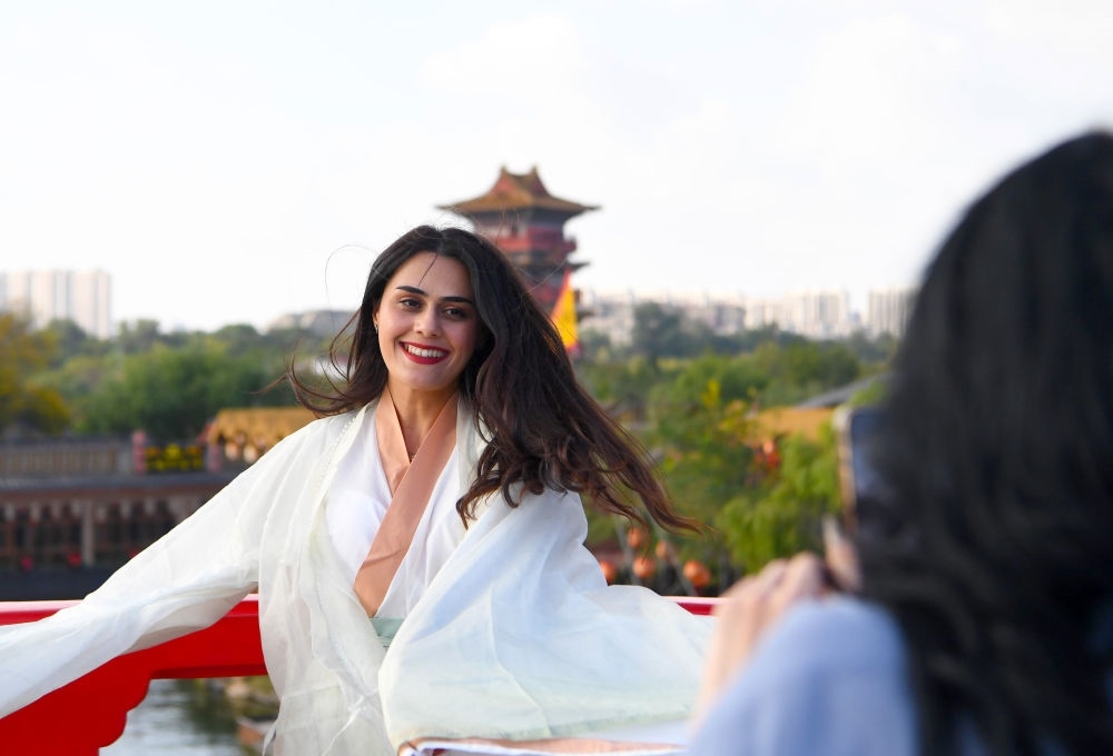 2024年10月18日,外國游客在清明上河園內(nèi)游玩。
