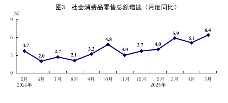 5月份,社會消費品零售總額41326億元,同比增長6.4%,比上月加快1.3個百分點;環(huán)比增長0.93%。按經(jīng)營單位所在地分,城鎮(zhèn)消費品零售額36057億元,同比增長6.5%;鄉(xiāng)村消費品零售額5269億元,增長5.4%。按消費類型分,商品零售額36748億元,增長6.5%;餐飲收入4578億元,增長5.9%?;旧铑惡筒糠稚夘惿唐蜂N售增勢較好,限額以上單位糧油食品類、金銀珠寶類、體育娛樂用品類商品零售額分別增長14.6%、21.8%、28.3%。消費品以舊換新政策持續(xù)顯效,限額以上單位家用電器和音像器材類、通訊器材類、文化辦公用品類、家具類商品零售額分別增長53.0%、33.0%、30.5%、25.6%。1—5月份,社會消費品零售總額203171億元,同比增長5.0%。全國網(wǎng)上零售額60402億元,同比增長8.5%。其中,實物商品網(wǎng)上零售額49878億元,增長6.3%,占社會消費品零售總額的比重為24.5%。1—5月份,服務零售額同比增長5.2%。