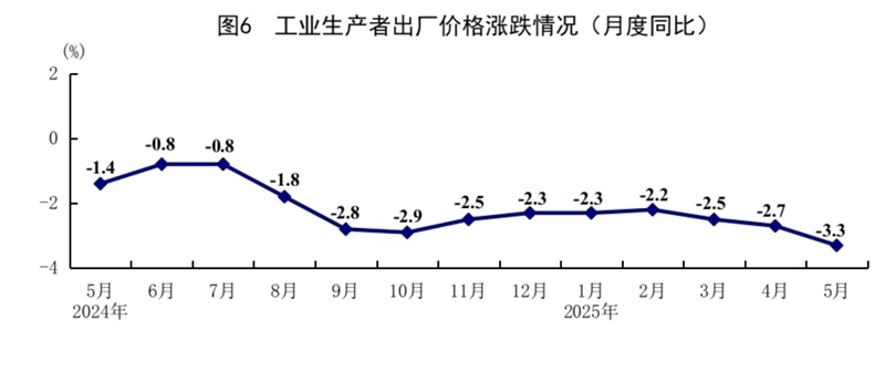 5月份,全國工業(yè)生產(chǎn)者出廠價格同比下降3.3%,環(huán)比下降0.4%;全國工業(yè)生產(chǎn)者購進價格同比下降3.6%,環(huán)比下降0.6%。1—5月份,全國工業(yè)生產(chǎn)者出廠價格和購進價格均比上年同期下降2.6%。