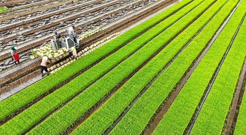 6月18日,在江蘇省海安市墩頭鎮(zhèn)千步村,農(nóng)民起水稻秧苗,準(zhǔn)備進(jìn)行水稻機(jī)插(無人機(jī)照片)。