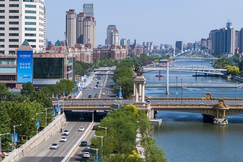 天津市南開區(qū)的一處人行天橋上懸掛著2025夏季達(dá)沃斯論壇宣傳標(biāo)語(yǔ)(6月21日攝,無(wú)人機(jī)照片)。