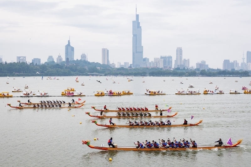 5月31日,龍舟隊在南京玄武湖上競逐(無人機照片)。