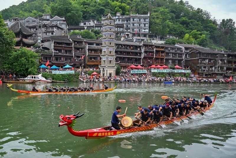 5月31日,在湖南省湘西土家族苗族自治州鳳凰古城,龍舟隊展開激烈角逐。