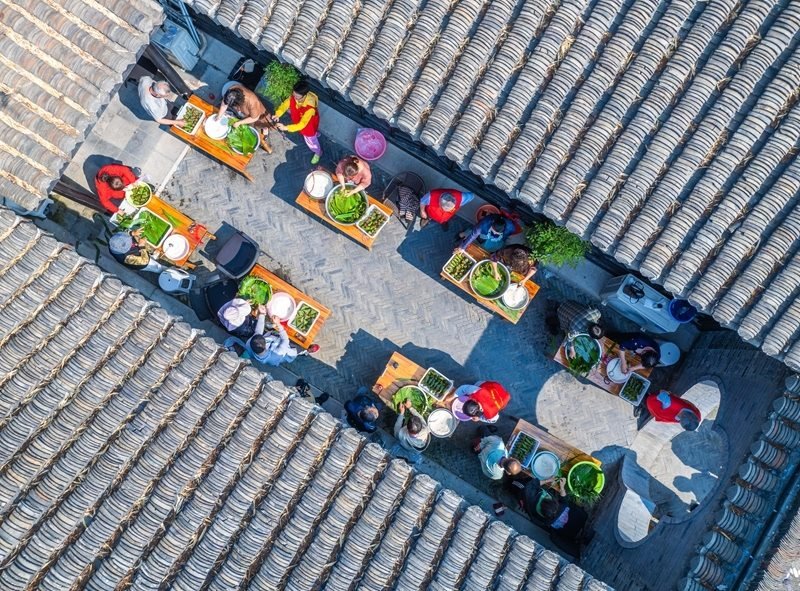 5月29日,在江蘇省興化市新時代文明實踐中心,居民參加包粽子比賽(無人機照片)。