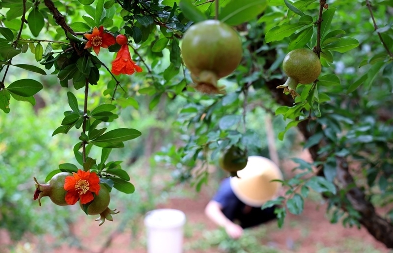 6月18日,在山東棗莊嶧城石榴園,果農在石榴樹下勞作。