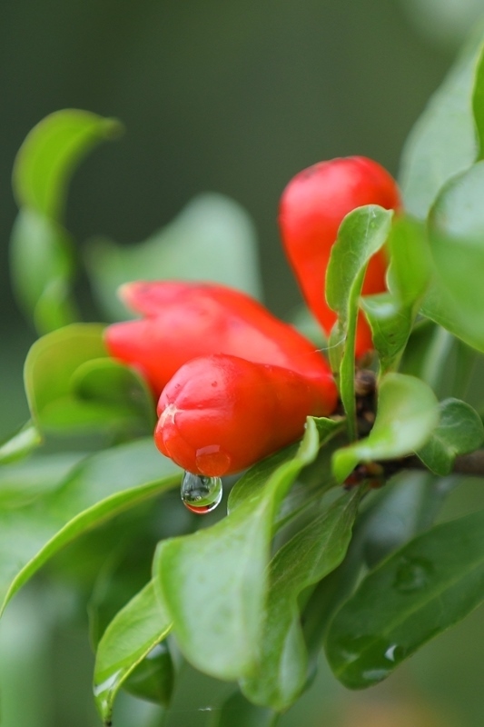 6月9日在浙江省嘉興市西南湖生態(tài)公園拍攝的雨后石榴花花苞。