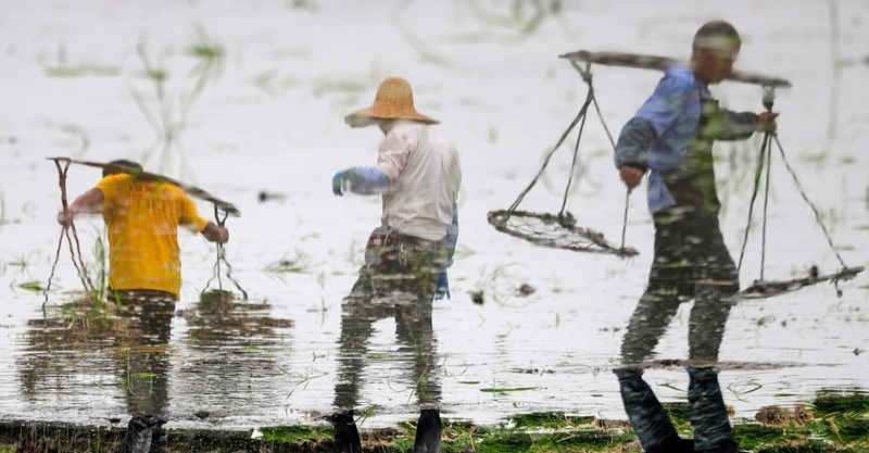6月14日,在江蘇里下河地區(qū)農科所(揚州市農科院),農民在水稻田里起秧、運秧(照片翻轉180度)。