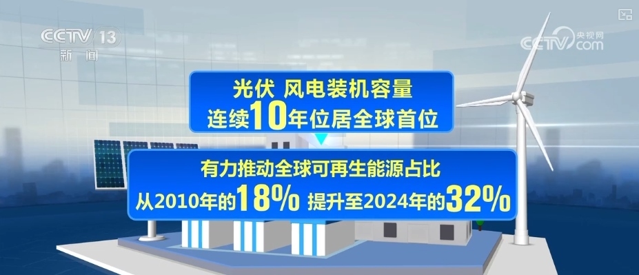 《報告》指出,作為全球最大能源消費國與清潔能源投資國,2024年,中國清潔能源投資規(guī)模為6250億美元,占全球比重的三分之一。光伏、風(fēng)電裝機容量連續(xù)10年位居全球首位,有力推動全球可再生能源占比從2010年的18%提升至2024年的32%。