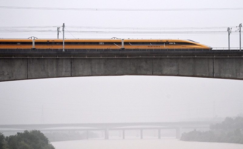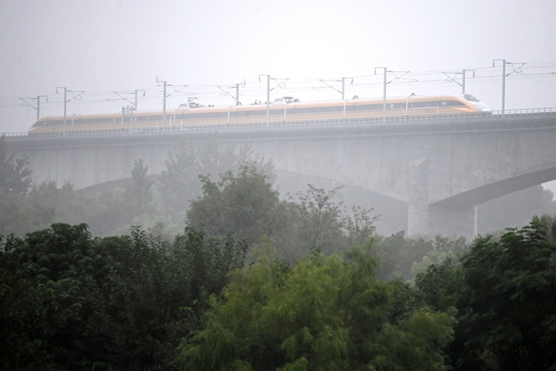 9月11日,聯(lián)調(diào)聯(lián)試綜合檢測(cè)列車駛過(guò)位于陜西省西安市的西延高鐵渭河特大橋。