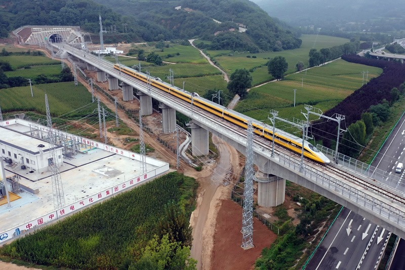 9月11日,聯(lián)調(diào)聯(lián)試綜合檢測(cè)列車駛過(guò)位于陜西省銅川市的西延高鐵王家河特大橋。