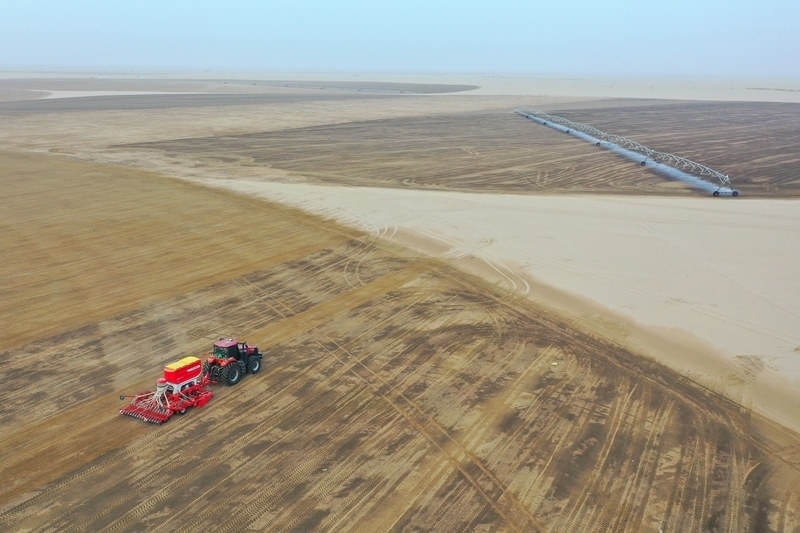 在新疆和田地區(qū)策勒縣4萬(wàn)畝苜蓿種植基地,農(nóng)機(jī)手駕駛機(jī)械在播種苜蓿(9月9日攝,無(wú)人機(jī)照片)。