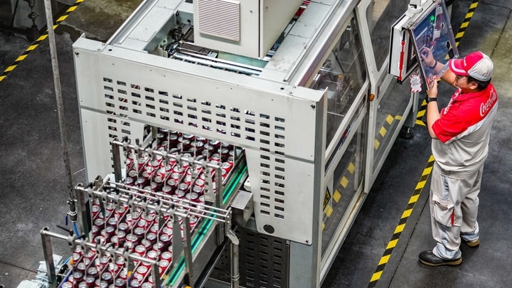 中糧可口可樂飲料(貴州)有限公司的工作人員在生產(chǎn)線旁進行操作(2025年8月24日攝)。新華社記者 陶亮 攝