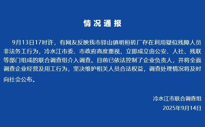 據(jù)“冷水江新聞”微信公眾號消息,9月13日17時許,有網(wǎng)友反映湖南冷水江市鐸山鎮(zhèn)明桓磚廠存在利用疑似殘障人員非法務(wù)工行為,冷水江市委、市政府高度重視,立即成立由公安、人社、殘聯(lián)等部門組成的聯(lián)合調(diào)查組介入調(diào)查。目前已依法控制了企業(yè)負責(zé)人,并將全面調(diào)查企業(yè)經(jīng)營及用工行為,堅決維護相關(guān)人員合法權(quán)益,調(diào)查處理情況將及時向社會公布。