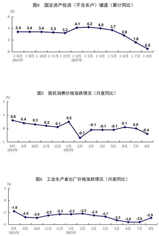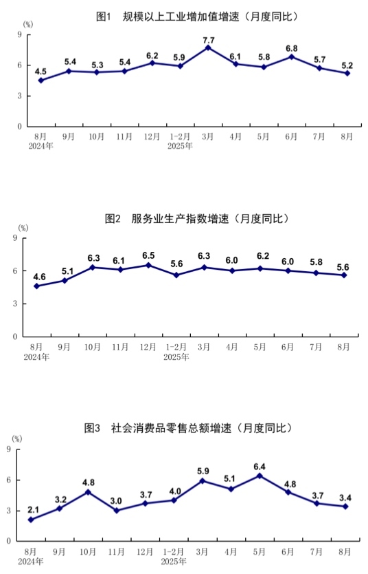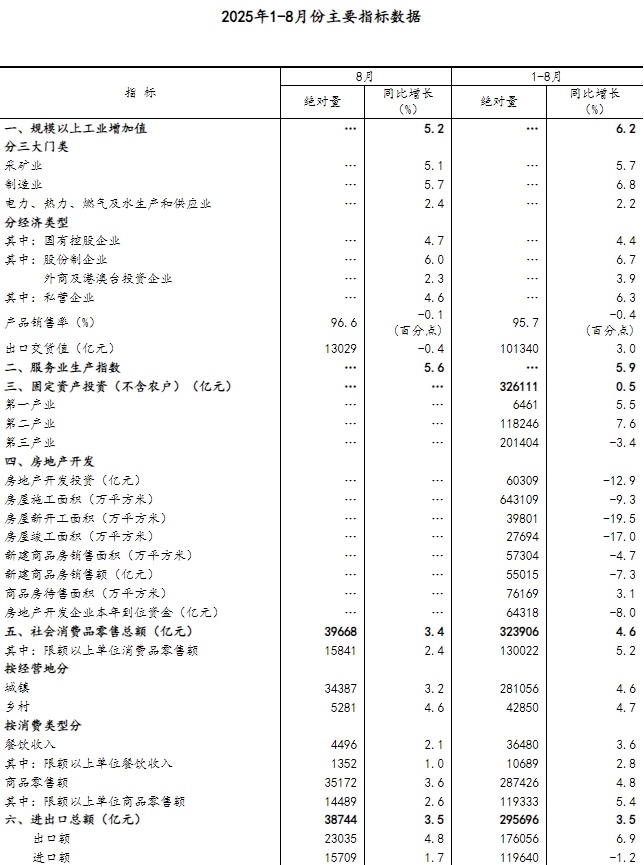 8月份,社會消費(fèi)品零售總額39668億元,同比增長3.4%;環(huán)比增長0.17%。按經(jīng)營單位所在地分,城鎮(zhèn)消費(fèi)品零售額34387億元,同比增長3.2%;鄉(xiāng)村消費(fèi)品零售額5281億元,增長4.6%。按消費(fèi)類型分,商品零售額35172億元,增長3.6%;餐飲收入4496億元,增長2.1%?;旧铑惡筒糠稚夘惿唐蜂N售增勢良好,限額以上單位日用品類、糧油食品類、體育娛樂用品類商品零售額分別增長7.7%、5.8%、16.9%。消費(fèi)品以舊換新政策效果繼續(xù)顯現(xiàn),限額以上單位家具類、家用電器和音像器材類、文化辦公用品類、通訊器材類商品零售額分別增長18.6%、14.3%、14.2%、7.3%。1—8月份,社會消費(fèi)品零售總額323906億元,同比增長4.6%。全國網(wǎng)上零售額99828億元,同比增長9.6%。其中,實物商品網(wǎng)上零售額80964億元,增長6.4%,占社會消費(fèi)品零售總額的比重為25.0%。1—8月份,服務(wù)零售額同比增長5.1%。其中,文體休閑服務(wù)類、旅游咨詢租賃服務(wù)類、交通出行服務(wù)類零售額較快增長。