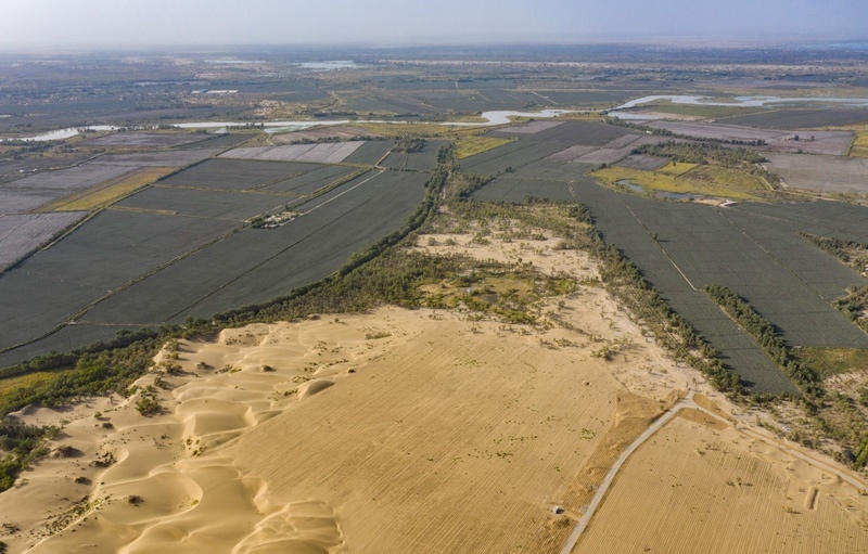 5月22日,在新疆尉犁縣境內(nèi)的塔里木河南岸防沙治沙區(qū),大型機械在平整沙丘(無人機照片)。