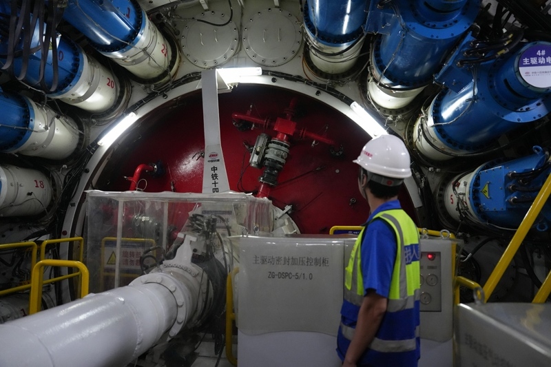 9月22日,中鐵十四局技術人員在甬舟鐵路金塘海底隧道“甬舟號”盾構機內關注設備運行情況。