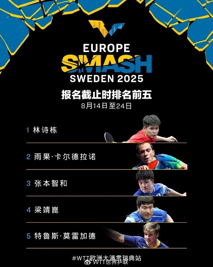 新華社北京7月6日電 世界乒乓球職業(yè)大聯(lián)盟(WTT)歐洲大滿貫賽瑞典站將于8月14日至24日在馬爾默舉行。首批參賽名單6日公布,男、女單打世界排名第一的國乒隊員林詩棟、孫穎莎在列。