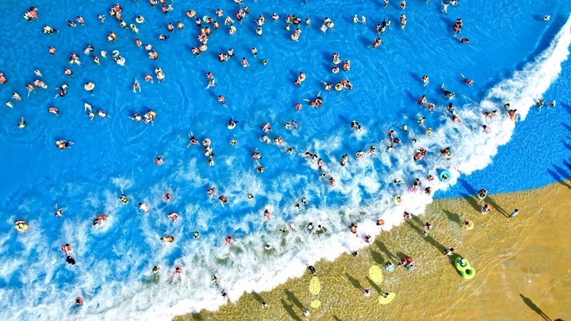 7月5日,浙江省湖州市長(zhǎng)興縣太湖圖影旅游度假區(qū)龍之夢(mèng)樂園嬉水世界,游客親水消暑(無(wú)人機(jī)照片)。